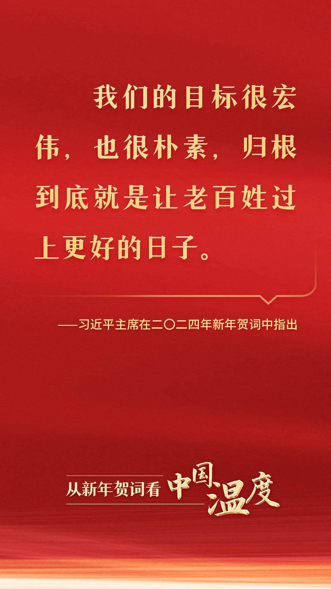 從黃土地走來(lái),從大隊(duì)黨支部書(shū)記到黨和國(guó)家最高領(lǐng)導(dǎo)人,習(xí)近平同志深諳國(guó)情、社情、民情。在二〇二四年新年賀詞中,習(xí)近平主席話語(yǔ)懇切:“我們的目標(biāo)很宏偉,也很樸素,歸根到底就是讓老百姓過(guò)上更好的日子。”