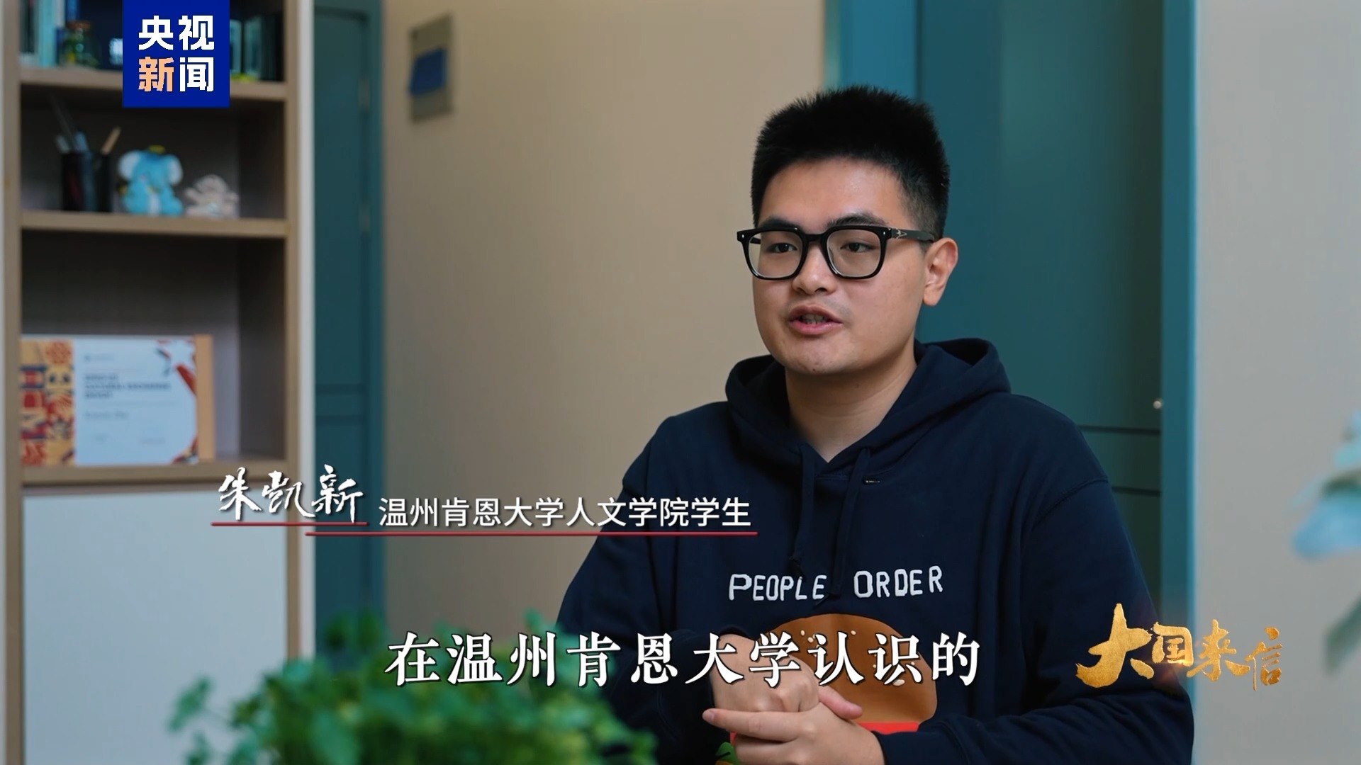 溫州肯恩大學人文學院學生 朱凱新:我有一位特別好的朋友,他叫亞歷山德羅,我跟他是在去年在溫州肯恩大學認識的,我們真是一見如故。我們也一起去了很多中國的城市,我會覺得這是一個特別特別好的機會,能夠帶我們的美國朋友感受我們中國的博大精深、壯美的風景。我們一起去了上海,一起去了西安。去西安是因為他特別喜歡兵馬俑,我們一直保持著聯(lián)系。