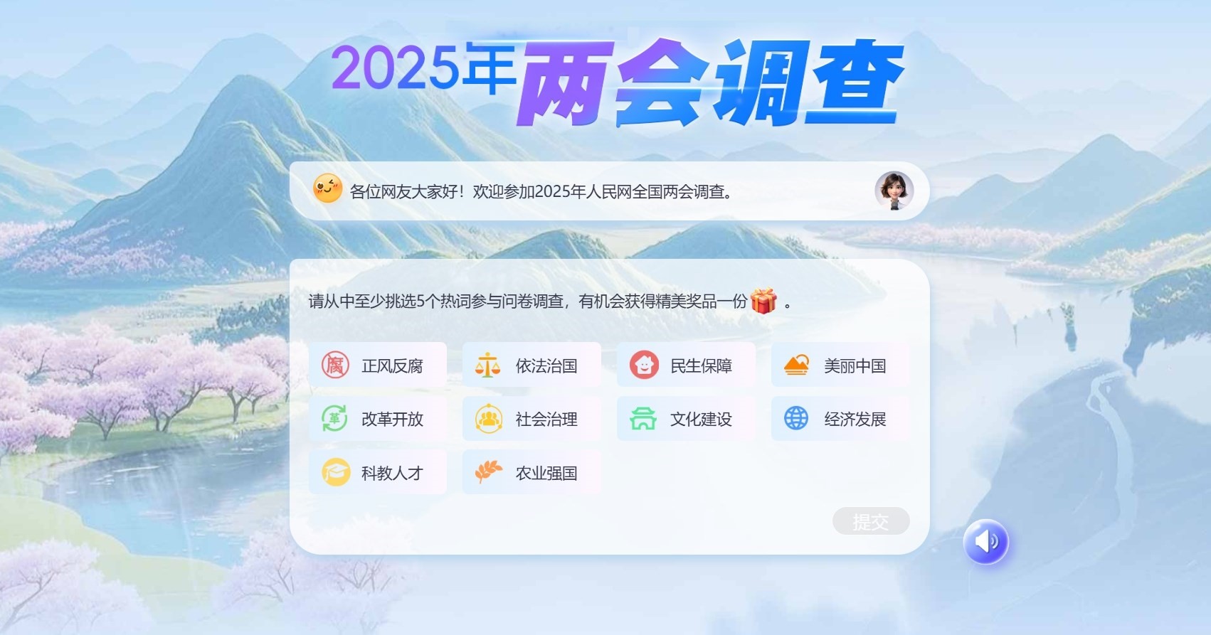 您期待哪些保障和改善民生領域的改革舉措落地?您認為提升社會治理水平應重點改進哪些方面?全面推進依法治國的系列舉措您對哪些最為關注……2025年全國兩會召開期間,人民網記者將把調查結果和網友心聲帶給代表委員。