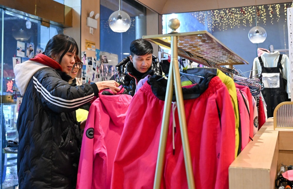 2025年1月23日,游客在湖北神農(nóng)架林區(qū)木魚(yú)鎮(zhèn)街邊一家店鋪挑選雪具雪服。自然天成的地理環(huán)境造就豐富的冰雪資源,也給當(dāng)?shù)剡\(yùn)動(dòng)裝備銷售、租賃行業(yè)帶來(lái)了商機(jī)。