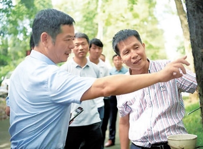 全國政協(xié)委員、中國科學院院士黃三文(左一)在海南省儋州市調研橡膠產(chǎn)業(yè)科技創(chuàng)新情況。