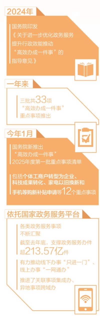 政府工作報(bào)告提出,“健全‘高效辦成一件事’重點(diǎn)事項(xiàng)清單管理和常態(tài)化推進(jìn)機(jī)制,完善覆蓋全國的一體化在線政務(wù)服務(wù)平臺(tái)。”
