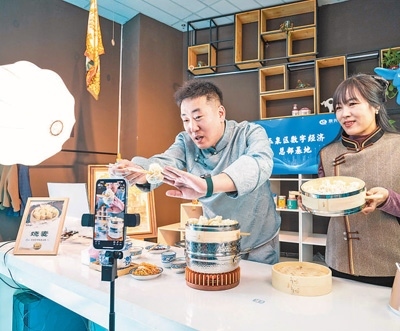 3月19日,內蒙古呼和浩特市玉泉區(qū)數(shù)字經濟總部基地直播間內,主播在推薦地方特色美食燒麥。
