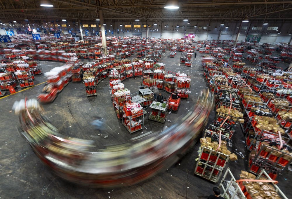 2023年1月31日,臺車在昆明國際花卉拍賣交易中心運(yùn)輸鮮花。