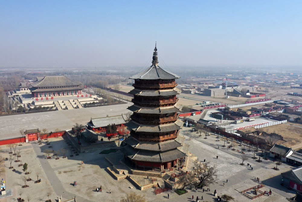 位于山西朔州市的應(yīng)縣木塔建于遼代清寧二年(1056年),塔高67.31米,上下連接的全部架構(gòu)均由卯榫咬合而成,是世界上現(xiàn)存最古老、最高大的純木結(jié)構(gòu)建筑(2025年3月7日攝,無(wú)人機(jī)照片)。