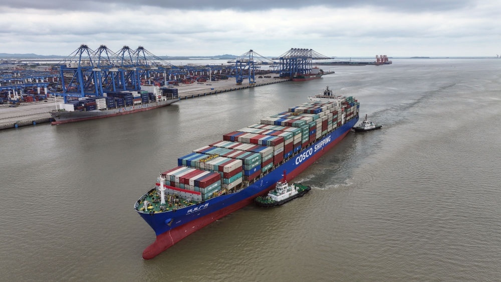 2024年5月19日,一艘海輪在廣西欽州港碼頭靠泊(無人機(jī)照片)。欽州港是北部灣港的組成部分,也是中國(guó)西南地區(qū)通往東盟的重要出???。西部陸海新通道利用鐵路、公路、水運(yùn)等多種運(yùn)輸方式,由重慶一路向南,經(jīng)廣西北部灣出海通達(dá)世界各地。截至2025年1月1日,北部灣港總航線達(dá)80條,其中外貿(mào)航線49條,基本實(shí)現(xiàn)國(guó)內(nèi)主要港口和東南亞、東北亞主要港口全覆蓋。
