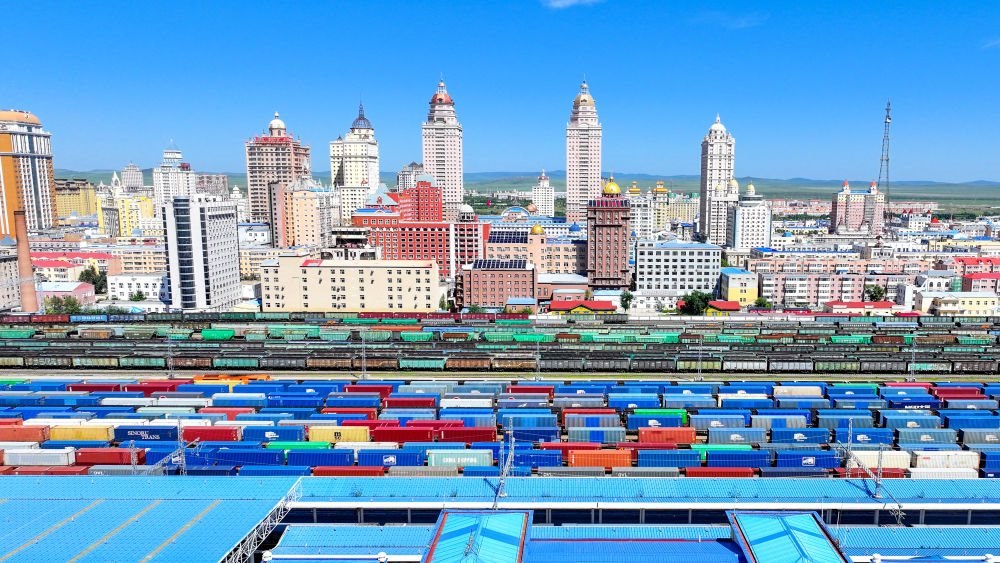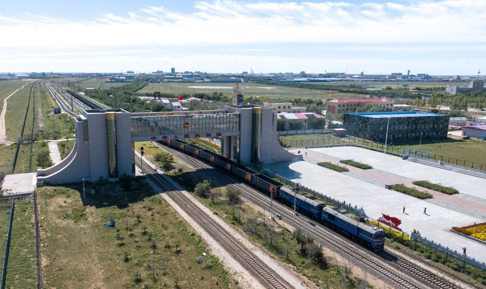 2024年8月20日,中歐班列在內(nèi)蒙古滿洲里口岸準(zhǔn)備出境(無人機(jī)照片)。滿洲里口岸位于中俄蒙三國(guó)交界處,是中國(guó)最大的陸路口岸,也是連接俄羅斯、蒙古國(guó)的重要樞紐。2024年,滿洲里口岸中歐班列通行量突破4000列,為推進(jìn)高質(zhì)量共建“一帶一路”注入新動(dòng)能。