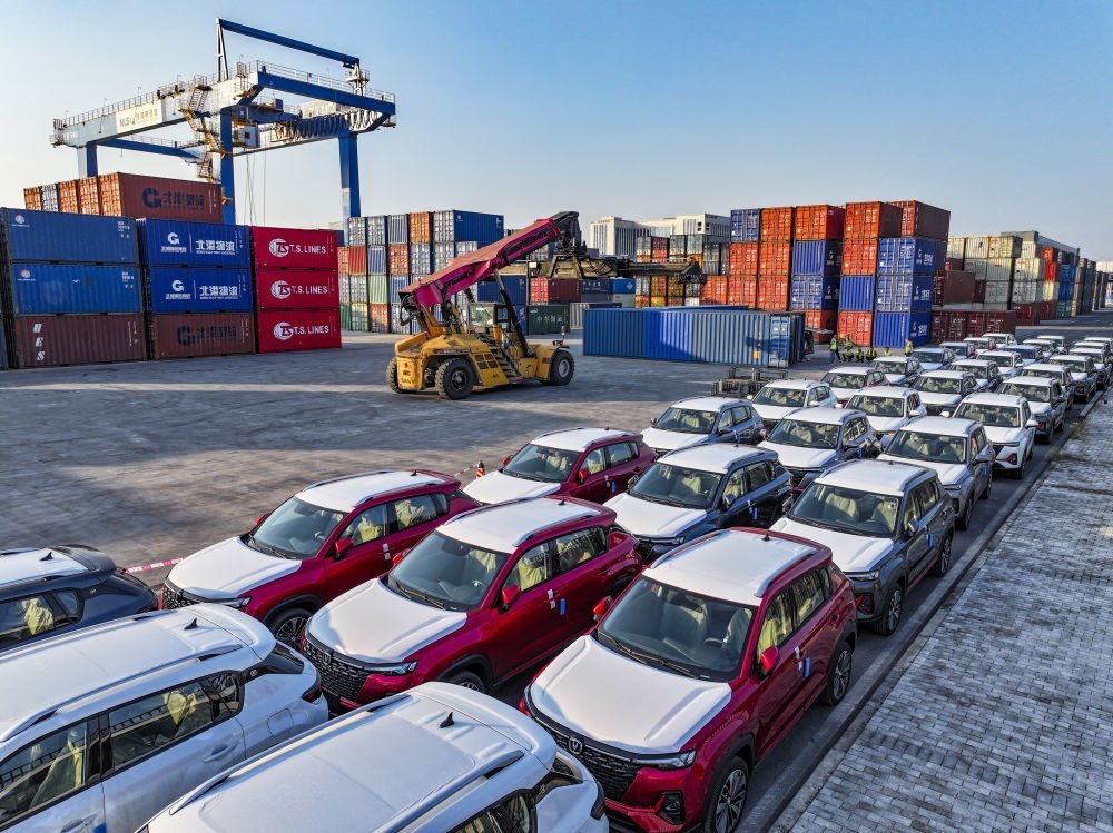 2024年10月28日在重慶國(guó)際物流樞紐園區(qū)西部陸海新通道重慶無水港拍攝的出口汽車裝運(yùn)現(xiàn)場(chǎng)(無人機(jī)照片)。位于重慶市沙坪壩區(qū)的重慶國(guó)際物流樞紐園區(qū),是重慶中歐班列、西部陸海新通道班列、渝滿俄班列、渝甬班列的主要到發(fā)點(diǎn),截至2024年10月,已開通班列線路62條,輻射125個(gè)國(guó)家和地區(qū)的542個(gè)港口。