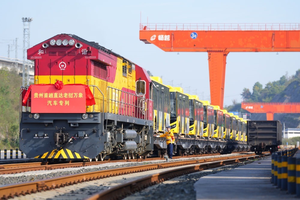 2024年10月28日,裝載著28輛“貴州造”新能源客車的出口專列停靠在貴陽國(guó)際陸港都拉營(yíng)站,準(zhǔn)備經(jīng)由云南磨憨口岸出境前往老撾萬象。這是貴州的中老班列首次整列直發(fā),也是貴州本土生產(chǎn)的新能源客車首次出口老撾。