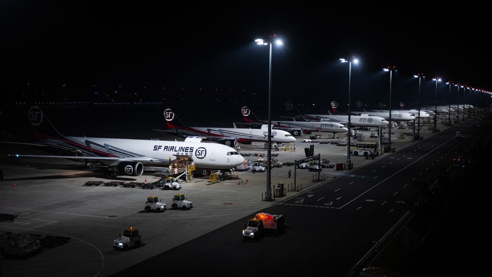 2024年5月25日凌晨,工人在湖北鄂州花湖國(guó)際機(jī)場(chǎng)停機(jī)坪裝卸貨物。鄂州花湖國(guó)際機(jī)場(chǎng)于2022年7月建成投運(yùn),是亞洲首個(gè)專業(yè)貨運(yùn)樞紐機(jī)場(chǎng)。截至2025年1月26日,鄂州花湖國(guó)際機(jī)場(chǎng)已開通37條國(guó)際貨運(yùn)航線和66條國(guó)內(nèi)貨運(yùn)航線。