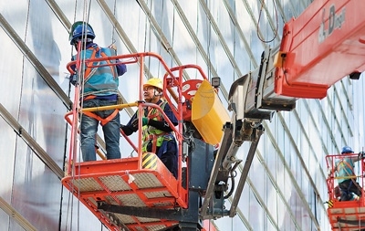 河北省石家莊美術(shù)館建設(shè)現(xiàn)場(chǎng),工人們?cè)诩泳o施工作業(yè)。