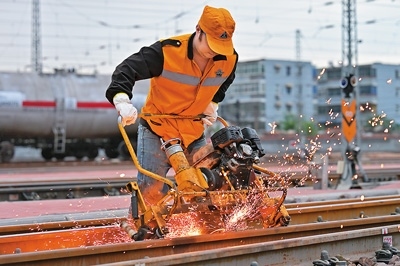 國(guó)鐵鄭州局新鄉(xiāng)橋工段職工在檢查整修鐵路道岔設(shè)備。