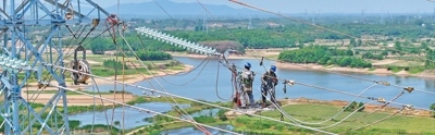 安徽省滁州市珠龍鎮(zhèn)220千伏清(流)環(huán)(漪)輸電工程現(xiàn)場(chǎng),工人在高空中進(jìn)行組塔作業(yè)。