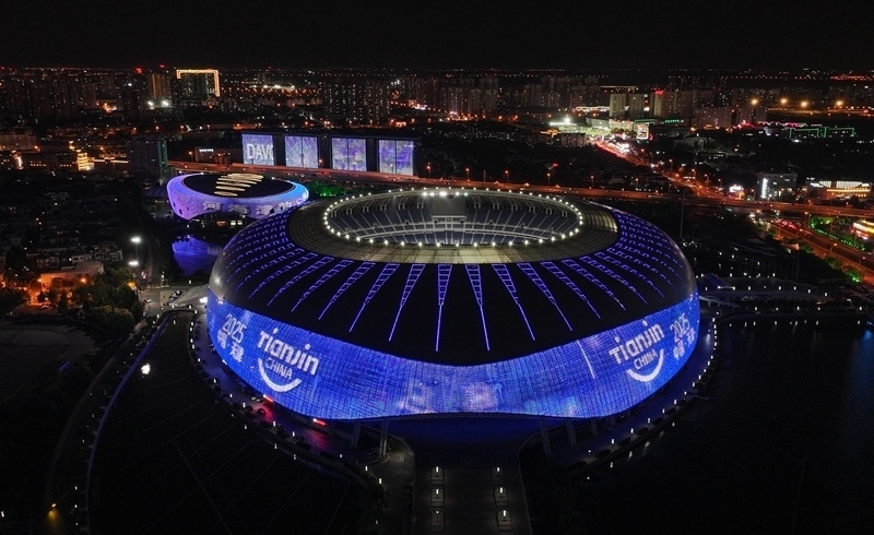 天津奧體中心體育場(chǎng)點(diǎn)亮夏季達(dá)沃斯主題燈光(無(wú)人機(jī)照片,6月20日攝)。