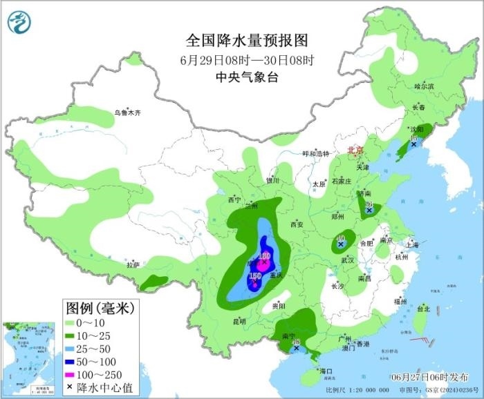 6月29日08時(shí)至30日08時(shí),四川中東部、重慶西南部、甘肅東南部、云南東北部等地的部分地區(qū)有大到暴雨,局地大暴雨(100~160毫米)。