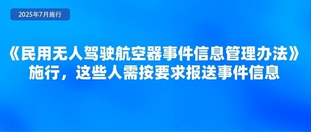為規(guī)范民用無人駕駛航空器事件信息的管理,準(zhǔn)確掌握有關(guān)無人駕駛航空器安全運行信息,及時發(fā)現(xiàn)安全隱患,控制運行風(fēng)險,日前,民航局印發(fā)《民用無人駕駛航空器事件信息管理辦法》,自7月1日起施行?!掇k法》要求,特定類和審定類合格證持有人、擁有中型和大型無人駕駛航空器50架(含)以上的開放類合格證持有人、擁有大型無人駕駛航空器10架(含)以上的開放類合格證持有人應(yīng)當(dāng)制定事件信息管理程序,指定滿足條件的人員負(fù)責(zé)事件信息管理,并按要求報送事件信息。事發(fā)相關(guān)單位和人員應(yīng)當(dāng)按照規(guī)定如實報告事件信息,不得瞞報、謊報或者遲報。