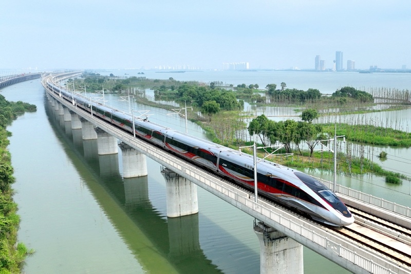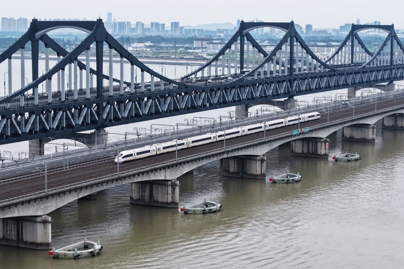 6月30日,一列動(dòng)車組列車經(jīng)過武漢天興洲大橋延長(zhǎng)線(無人機(jī)照片)。