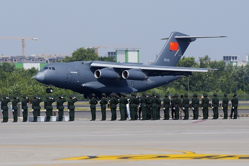 9月12日,第十二批在韓中國(guó)人民志愿軍烈士遺骸回國(guó)。這是接運(yùn)烈士遺骸回國(guó)的運(yùn)-20飛機(jī)降落在沈陽桃仙國(guó)際機(jī)場(chǎng)。