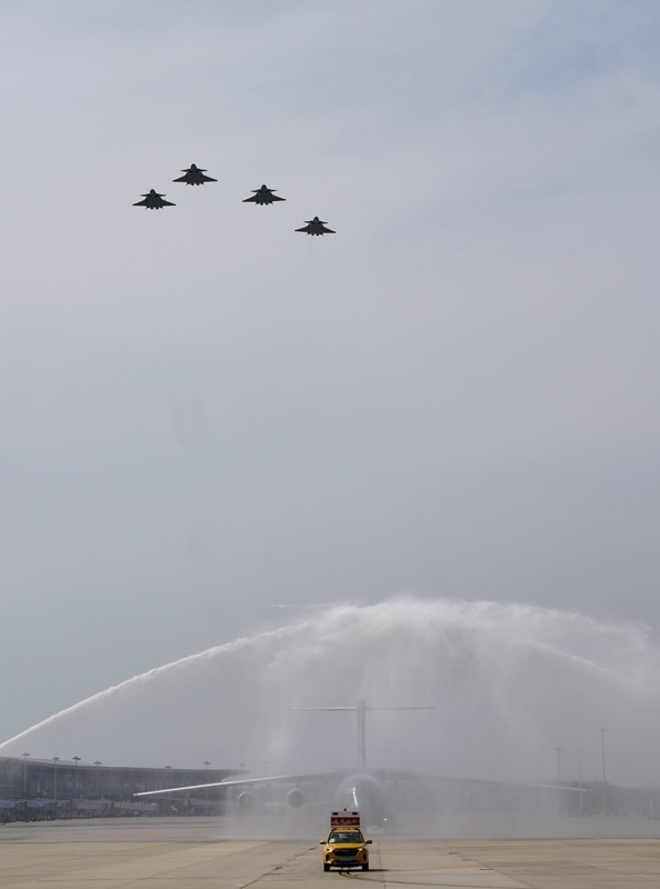 9月12日,第十二批在韓中國(guó)人民志愿軍烈士遺骸回國(guó)。這是在沈陽桃仙國(guó)際機(jī)場(chǎng),接運(yùn)烈士遺骸回國(guó)的運(yùn)-20專機(jī)通過水門。