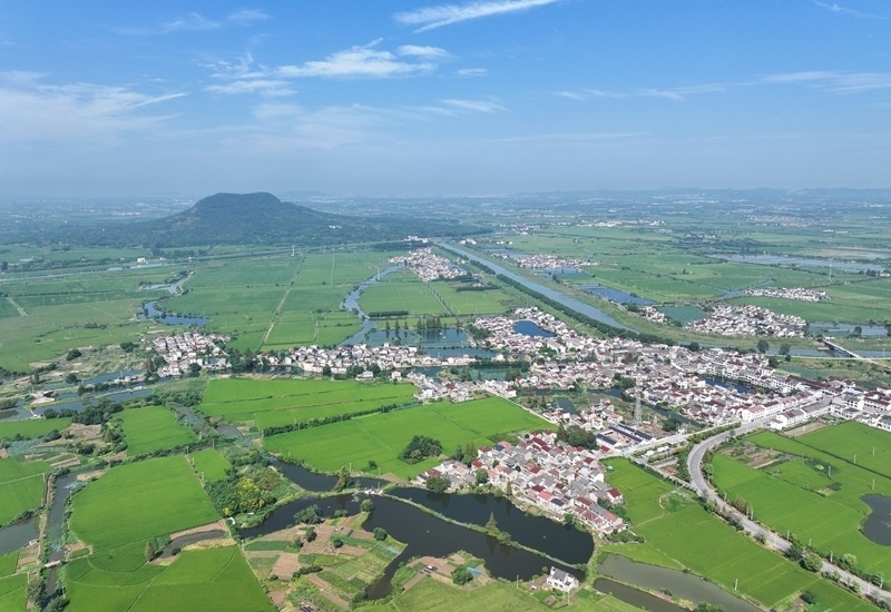 9月15日拍攝的句容赤山湖及周邊農(nóng)田(無(wú)人機(jī)全景照片)。