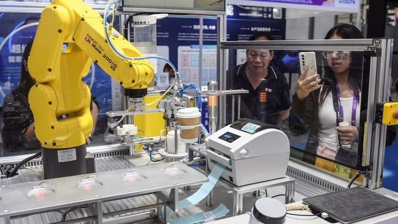2025年9月19日,在廣西南寧國際會展中心,機(jī)器人在制作飲品。新華社記者 張愛林 攝
