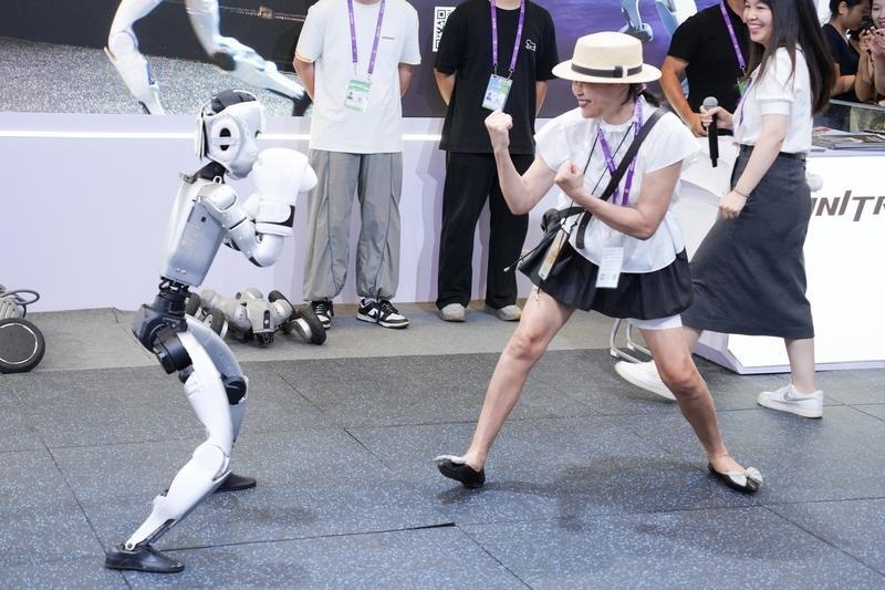 2025年9月19日,在廣西南寧國際會展中心人工智能專館,一臺人形機(jī)器人和觀眾表演拳擊。新華社記者 周汀鷺 攝
