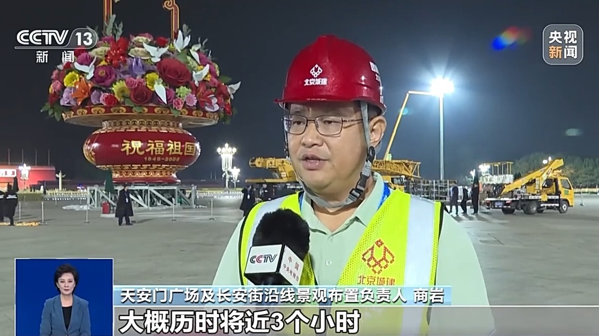 天安門廣場及長安街沿線景觀布置負(fù)責(zé)人 商巖:從吊裝準(zhǔn)備工作開始,一直到吊裝完成,大概歷時(shí)將近3個(gè)小時(shí)。保證籃盤和籃體的緊密結(jié)合,因?yàn)榛ɑ@在插置的過程中有一個(gè)觀賞角度,所以在吊裝和合龍整個(gè)過程當(dāng)中,四面相應(yīng)的觀賞面都要有工作人員要盯著,這個(gè)面不能有任何的變化。