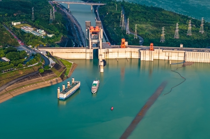 7月1日,在湖北宜昌,船舶有序通過三峽雙線五級(jí)船閘和升船機(jī)(無人機(jī)照片)。