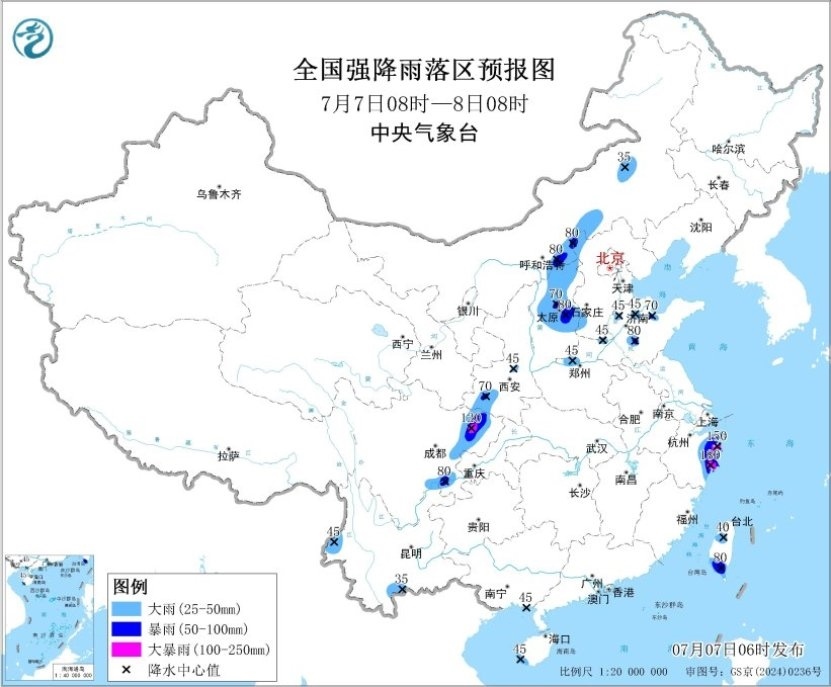 預(yù)計(jì),7月7日08時(shí)至8日08時(shí),浙江東部、內(nèi)蒙古中部、山西中北部、河北西北部和西南部、山東北部、河南西北部、陜西西南部、四川東部、云南西南部、臺灣島等地部分地區(qū)有大到暴雨,其中,浙江東部、四川東部等地部分地區(qū)有大暴雨(100~180毫米)。上述部分地區(qū)伴有短時(shí)強(qiáng)降水(最大小時(shí)降雨量20~50毫米,局地可超過70毫米),局地有雷暴大風(fēng)等強(qiáng)對流天氣。中央氣象臺7月7日06時(shí)繼續(xù)發(fā)布暴雨藍(lán)色預(yù)警。