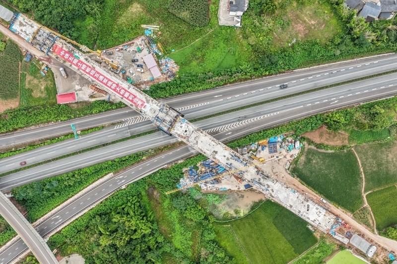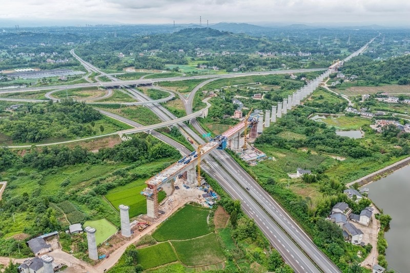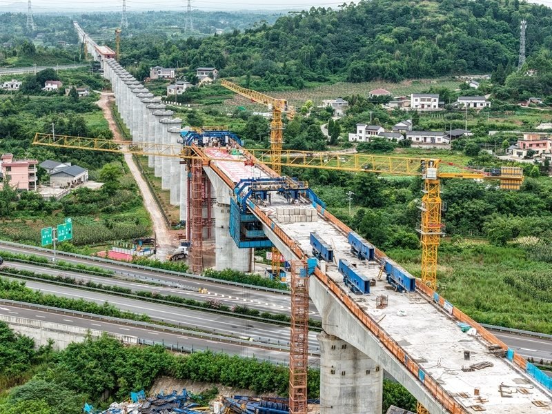 當(dāng)日,由中鐵五局承建的成渝中線高鐵土橋樞紐互通雙線特大橋連續(xù)梁順利合龍,該連續(xù)梁全長(zhǎng)約242米,是成渝中線高鐵重慶段跨度最大的連續(xù)梁。土橋樞紐互通雙線特大橋位于重慶市銅梁區(qū),全長(zhǎng)3271.6米,上跨重慶三環(huán)高速及銅安高速公路,共設(shè)有92個(gè)橋墩,2個(gè)橋臺(tái)。