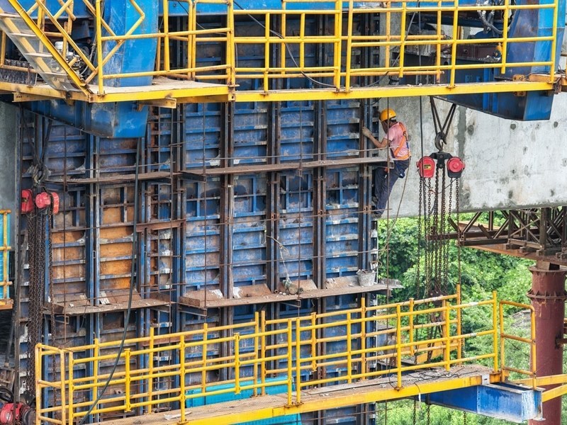 7月8日,工人在成渝中線高鐵土橋樞紐互通雙線特大橋建設(shè)現(xiàn)場(chǎng)施工作業(yè)(無(wú)人機(jī)照片)。