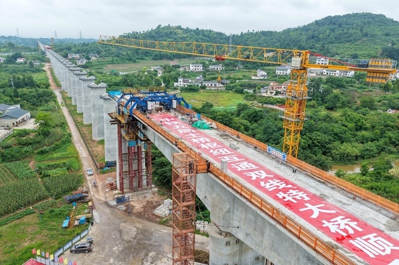 當(dāng)日,由中鐵五局承建的成渝中線高鐵土橋樞紐互通雙線特大橋連續(xù)梁順利合龍。該連續(xù)梁全長(zhǎng)約242米,是成渝中線高鐵重慶段跨度最大的連續(xù)梁。土橋樞紐互通雙線特大橋位于重慶市銅梁區(qū),全長(zhǎng)3271.6米,上跨重慶三環(huán)高速及銅安高速公路,共設(shè)有92個(gè)橋墩,2個(gè)橋臺(tái)。