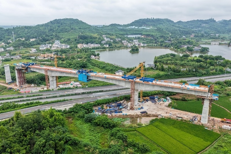 這是7月8日拍攝的成渝中線高鐵土橋樞紐互通雙線特大橋建設(shè)現(xiàn)場(chǎng)(無(wú)人機(jī)照片)。