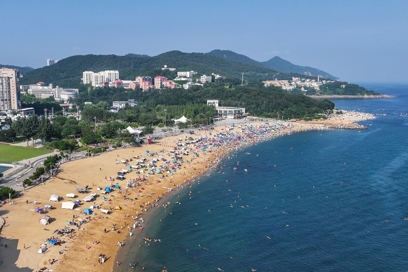 7月10日拍攝的大連傅家莊公園海濱沙灘(無人機照片)。
