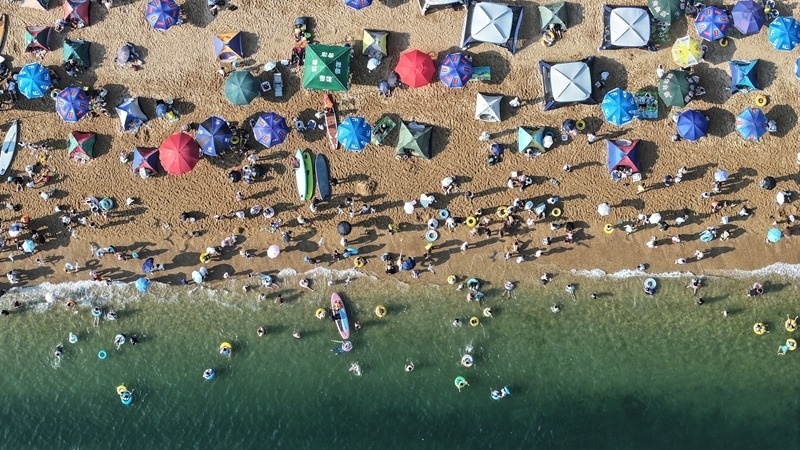 7月10日,游客在大連傅家莊公園海濱沙灘戲水消暑(無人機照片)。
