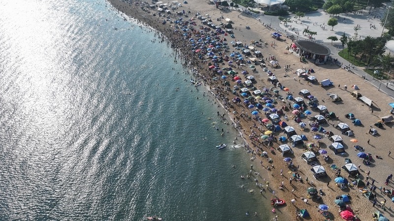 近日,遼寧省大連市持續(xù)高溫天氣,大連傅家莊公園海濱沙灘迎來大量游客,人們在海濱沙灘戲水消暑。