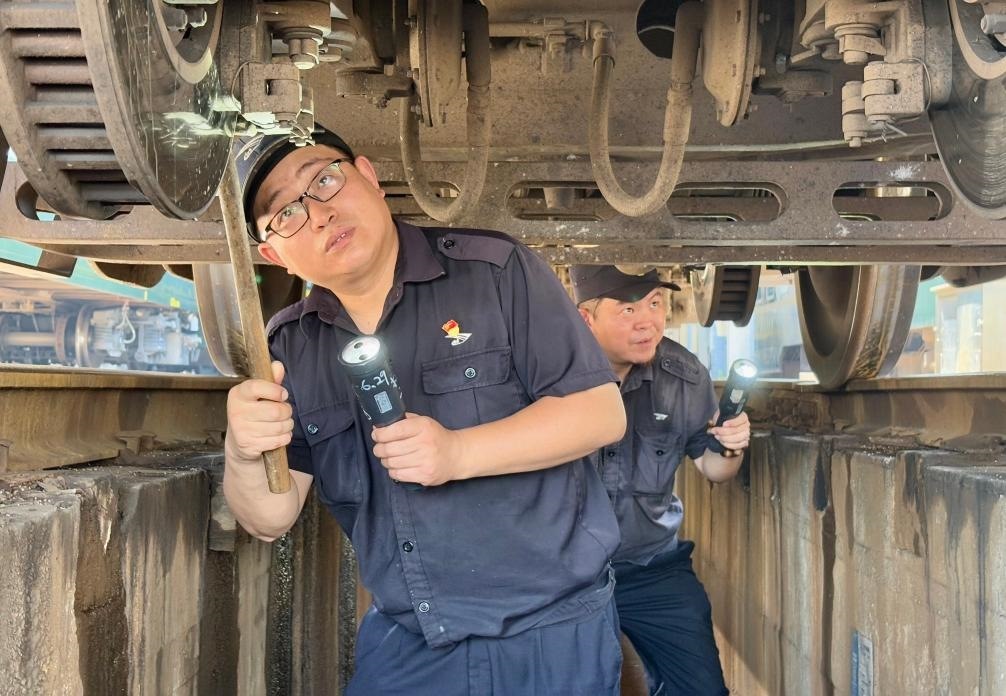 只見(jiàn)他俯下身鉆入車底,仔細(xì)檢查車輛的轉(zhuǎn)向架、制動(dòng)裝置等關(guān)鍵部位。車底空間狹小、光線不足,許立業(yè)需借助手電筒弓著腰作業(yè),不一會(huì)兒,汗水就浸濕了工作服。為了預(yù)防中暑,他掏出一瓶藿香正氣水,一口氣喝完,然后擦了擦臉上的汗水,繼續(xù)朝下節(jié)車廂走去。