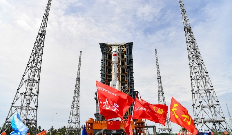 7月12日,天舟九號貨運飛船與長征七號遙十運載火箭組合體垂直轉(zhuǎn)運至發(fā)射區(qū)。