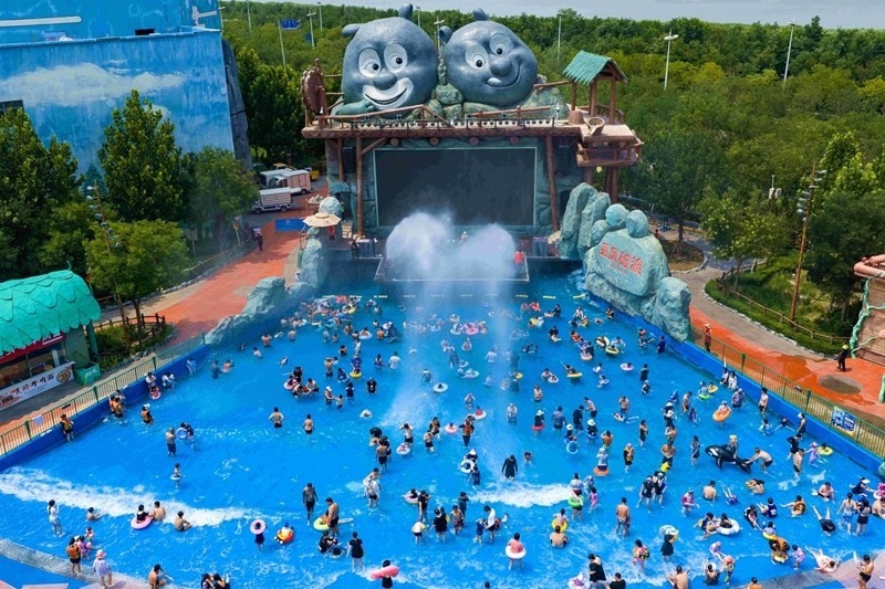7月12日,人們?cè)谔旖驗(yàn)I海新區(qū)方特水上樂園戲水納涼。