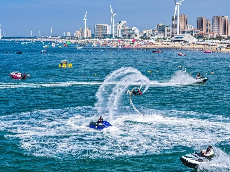 7月12日,在山東省榮成市那香海景區(qū),游客享受海上旅游項(xiàng)目帶來的清涼與歡樂(無人機(jī)照片)。