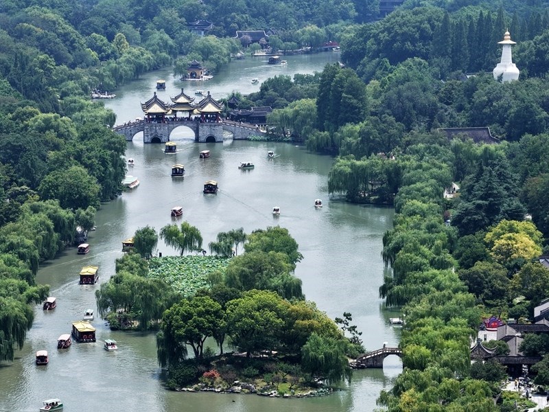 7月13日,游客乘坐游船在江蘇揚(yáng)州瘦西湖風(fēng)景區(qū)游覽(無人機(jī)照片)。