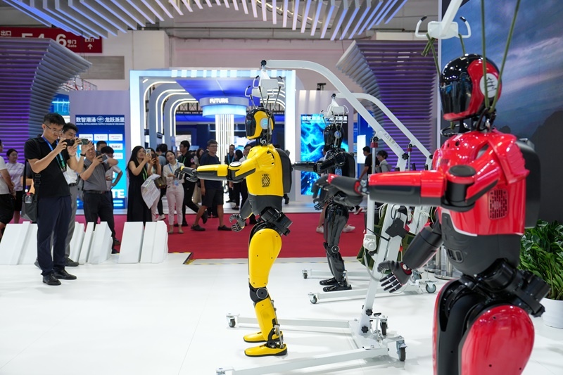 7月17日,在數(shù)字科技鏈展區(qū),參觀者觀看人形機(jī)器人表演。