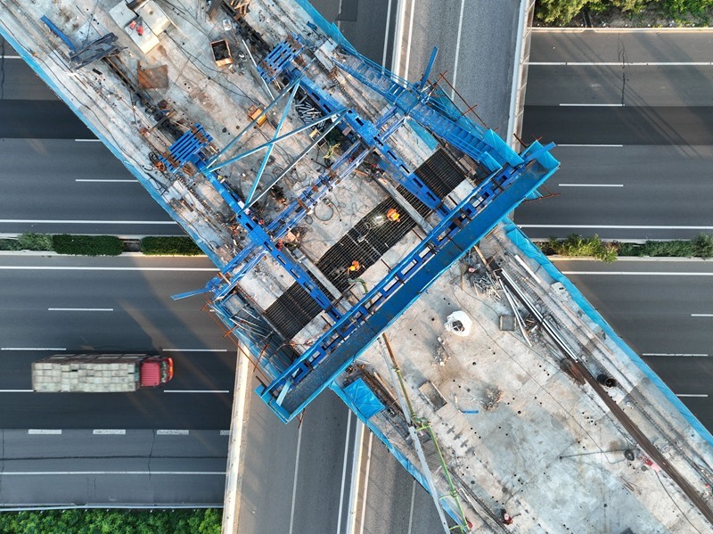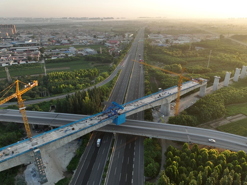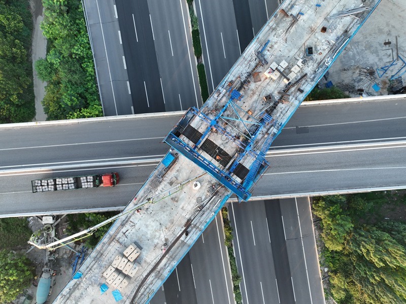 7月18日拍攝的雄忻高鐵保定東特大橋跨京港澳高速連續(xù)梁中跨施工現(xiàn)場(chǎng)(無(wú)人機(jī)照片)。
