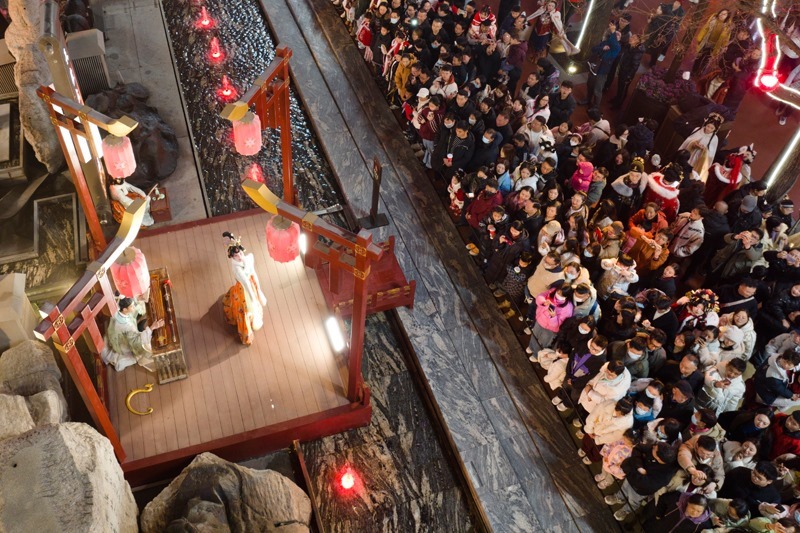 游客在西安大唐不夜城街區(qū)觀看以唐代歷史文化為背景創(chuàng)作的情景?。?月22日攝,無人機(jī)照片)。
