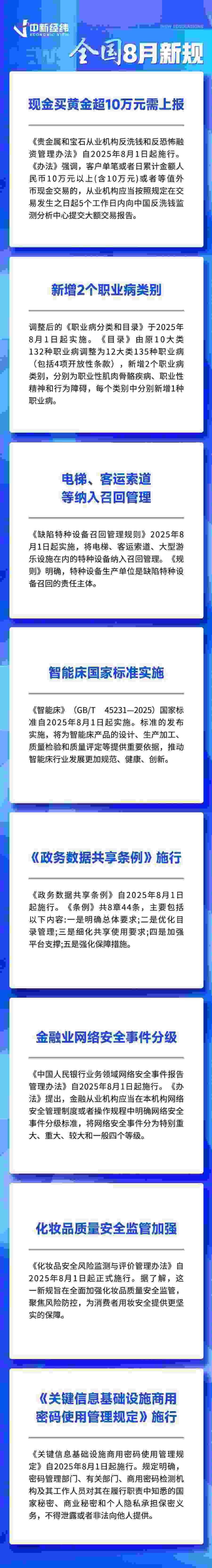 中新經(jīng)緯7月30日電 (熊思怡)現(xiàn)金買黃金超10萬元需上報(bào)、新增2個(gè)職業(yè)病類別、北京取消餐飲經(jīng)營場所面積限制……8月,這些新規(guī)事關(guān)你我,一起來看。