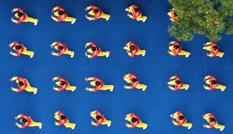 8月8日,在江蘇省揚州市宋夾城體育休閑公園,健身愛好者練習太極拳(無人機照片)。