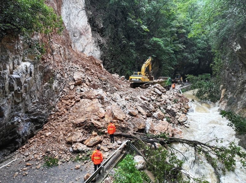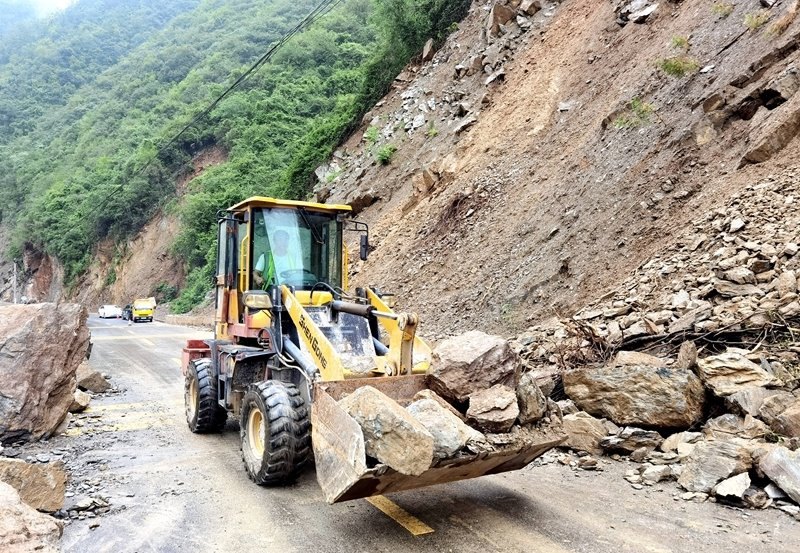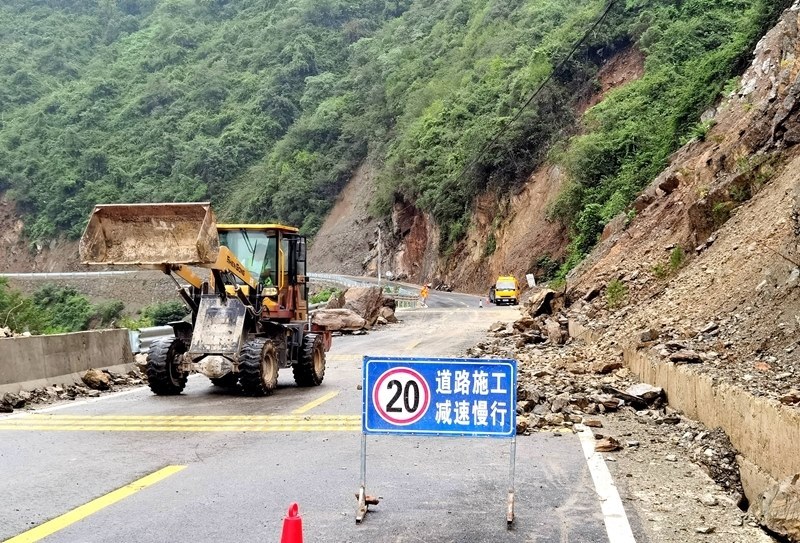 8月10日,在468省道??悼h寺坪鎮(zhèn)升石坪路段,公路養(yǎng)護(hù)部門(mén)工作人員駕駛裝載機(jī)處置路旁垮方。