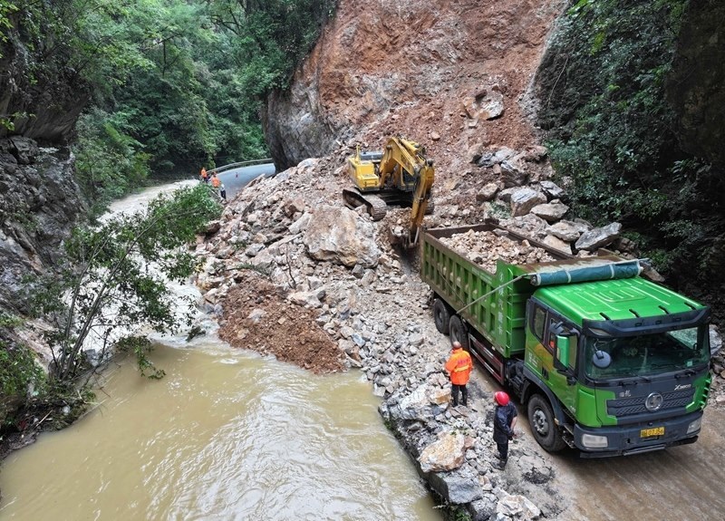 8月10日,在??悼h馬橋鎮(zhèn)堯(治河村)馬(橋鎮(zhèn))路6.2公里處,大型工程機(jī)械處置路旁崩塌的巖石(無(wú)人機(jī)照片)。