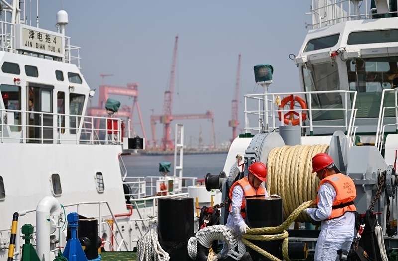 當(dāng)日,由4艘純電動港作拖輪組成的“綠色艦隊”在中船天津碼頭鳴笛啟航。