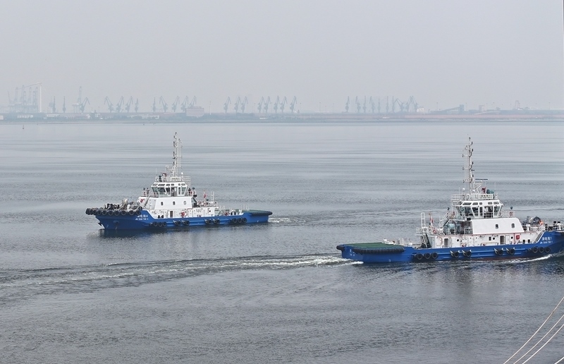 8月13日,由4艘純電動港作拖輪組成的“綠色艦隊”在中船天津碼頭鳴笛啟航。